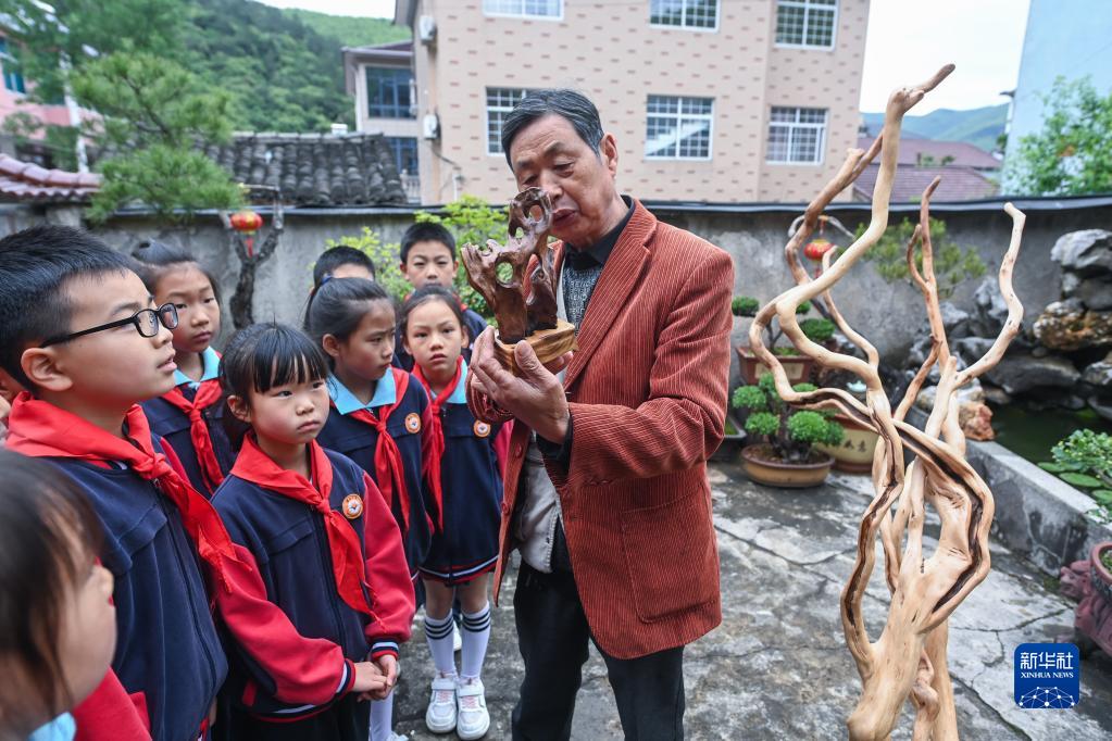 5月24日,煤山鎮新民村非遺傳承人佘廣坤(右一)在給長(cháng)興縣煤山鎮中心小學(xué)的學(xué)生介紹根雕藝術(shù)。