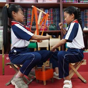 5月24日,小學(xué)生在河北省沙河市塔子峪村非遺傳習所內體驗四匹繒布制作技藝。