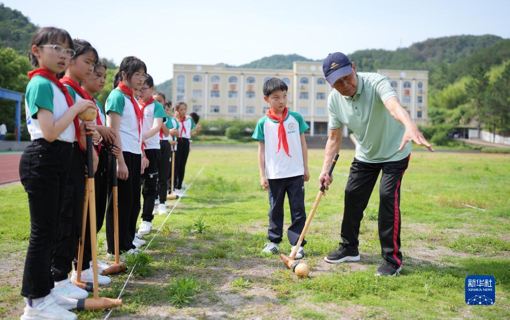 5月25日,小學(xué)生在教練帶領(lǐng)下學(xué)習木球。