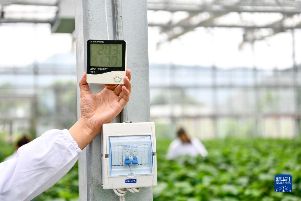 5月23日,工作人員在貴陽(yáng)市開(kāi)陽(yáng)縣南江蔬菜良種繁育中心查看育苗大棚內溫濕度。