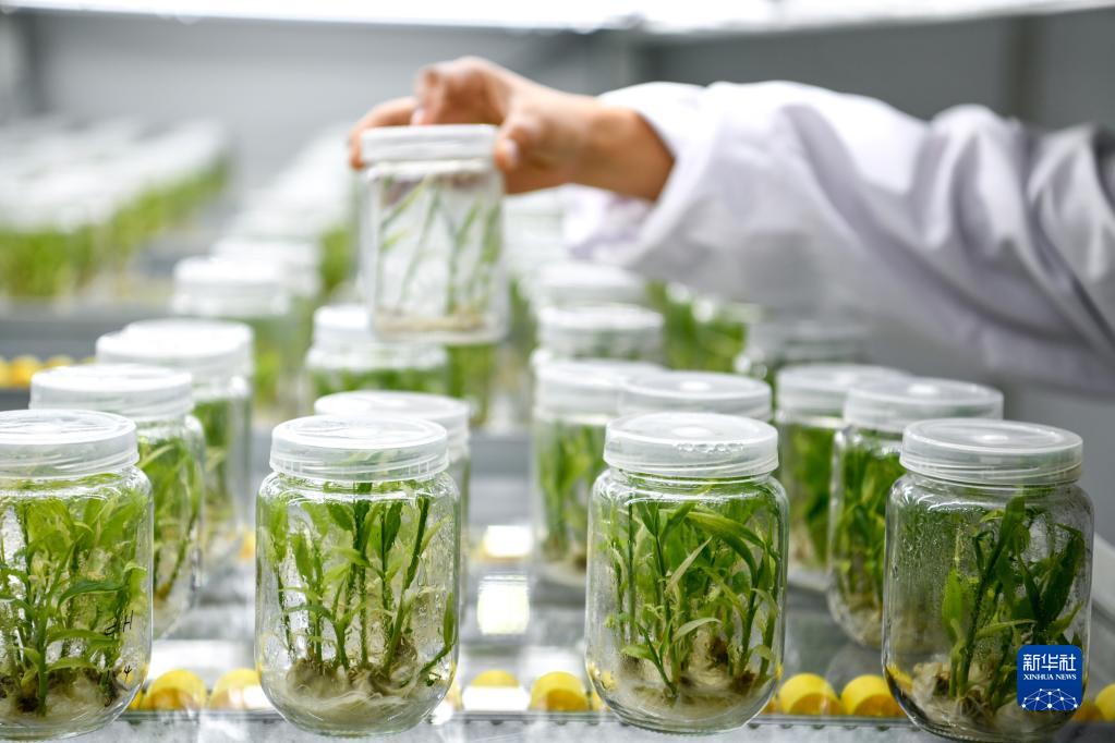 5月23日,工作人員在貴陽(yáng)市開(kāi)陽(yáng)縣南江蔬菜良種繁育中心的組培中心查看小黃姜苗生長(cháng)情況。