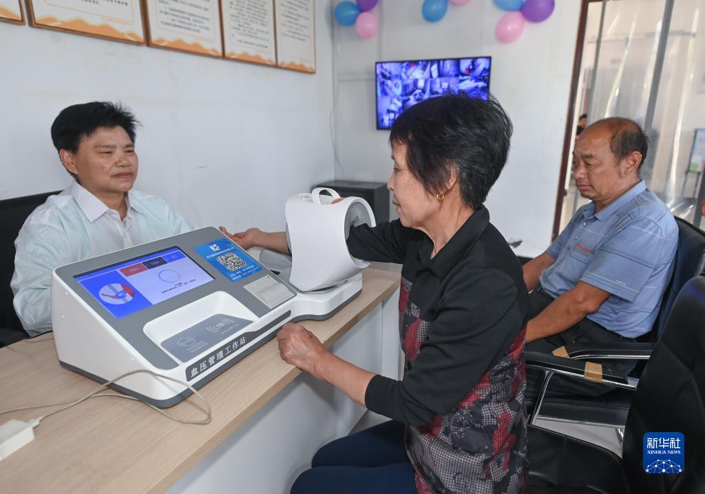 5月25日,在諸暨市姚江鎮的鎮級居家養老中心內,老人在測量血壓。