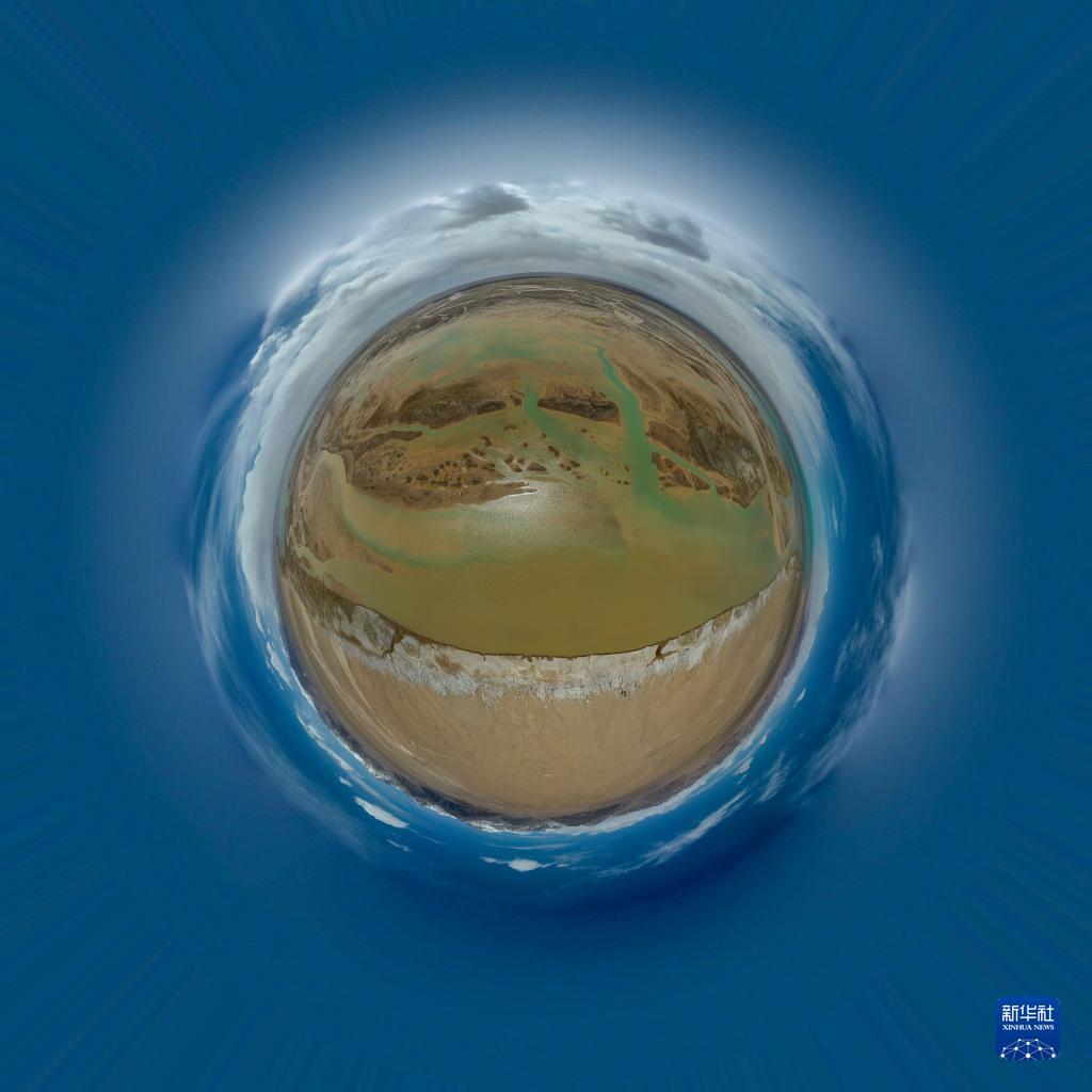 這是5月23日在新疆東昆侖庫木庫里盆地拍攝的阿雅克庫木湖河流入湖口(無(wú)人機球形全景照片)。