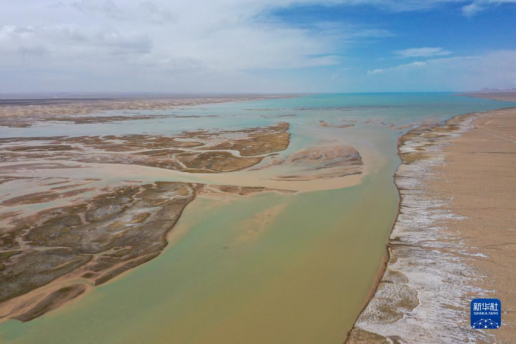 這是在新疆東昆侖庫木庫里盆地拍攝的阿雅克庫木湖河流入湖口(5月23日攝,無(wú)人機照片)。