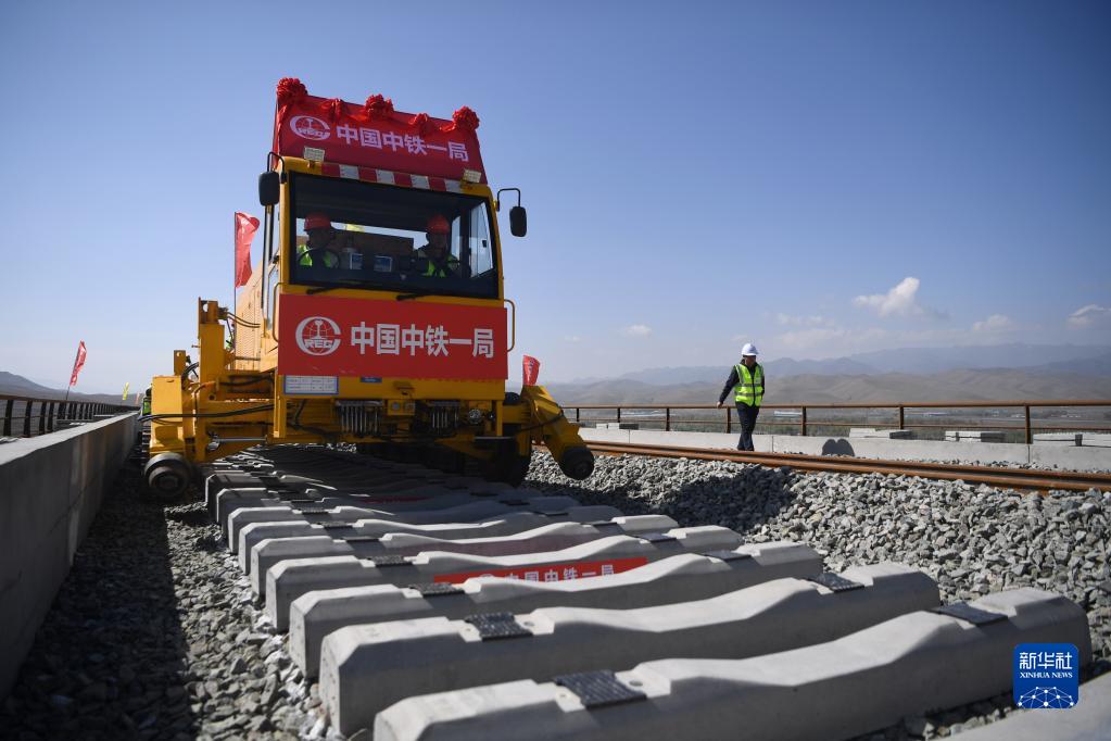 當日,在甘肅省武威市天祝藏族自治縣境內蘭(蘭州)張(張掖)三四線(xiàn)鐵路鋪軌施工現場(chǎng),一體式牽引車(chē)在中鐵一局施工人員的操作下,將一組500米長(cháng)的鋼軌精準鋪設在道床上,標志著(zhù)由中鐵一局承建的蘭張三四線(xiàn)鐵路蘭州至武威段進(jìn)入全線(xiàn)鋪軌階段。