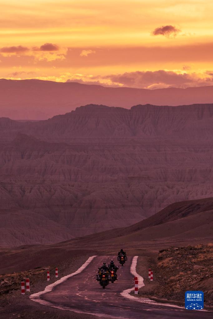 夕陽(yáng)時(shí)分,三位騎士駕駛摩托車(chē)駛向札達土林(5月25日攝)。