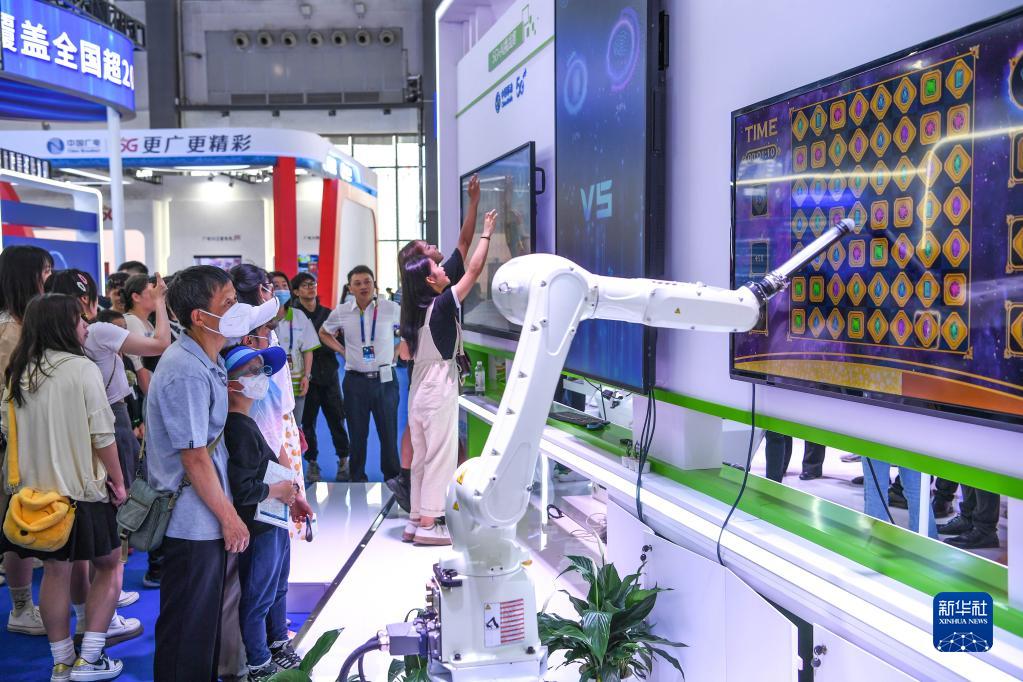 5月26日,參觀(guān)者在數博會(huì )展館體驗5G+AI人與機器人挑戰賽。