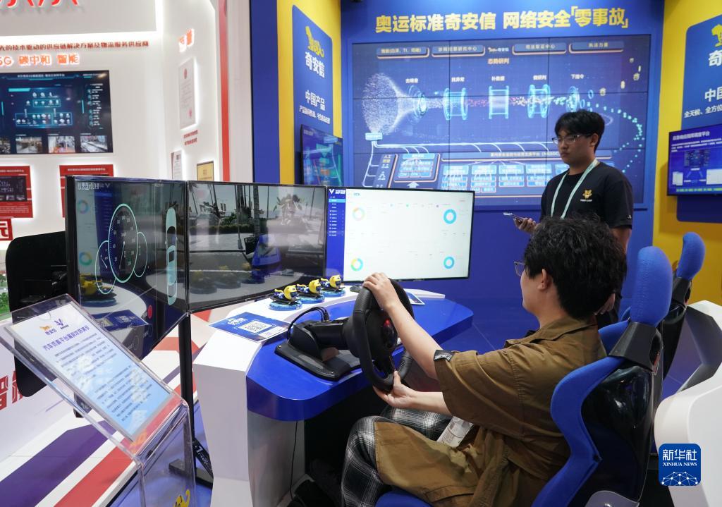 5月26日,在中關(guān)村國家自主創(chuàng )新示范區展示中心,工作人員(后)進(jìn)行汽車(chē)仿真平臺漏洞攻防演示。