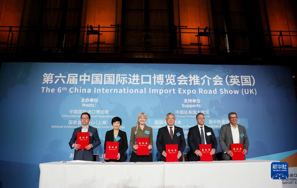 5月25日,在英國倫敦,英中貿易協(xié)會(huì )、匯豐銀行等組織和企業(yè)代表與中國國際進(jìn)口博覽局簽署合作意向書(shū)或參展合同后合影。