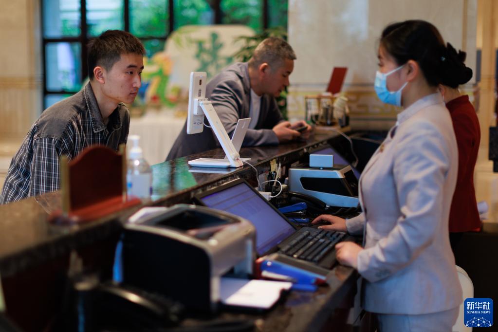5月23日,游客在黔南州一酒店內使用“數字底座”酒店企業(yè)端辦理入住業(yè)務(wù)。