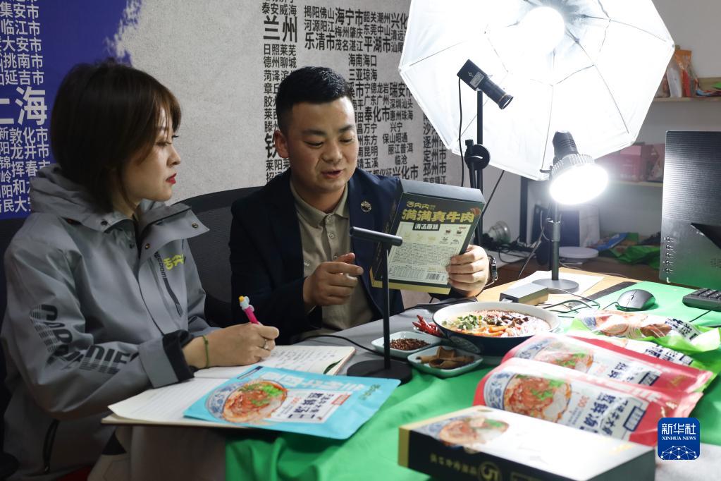 5月26日,在位于蘭州市的舌尖尖居家牛肉面倉儲中心,工作人員進(jìn)行直播帶貨。