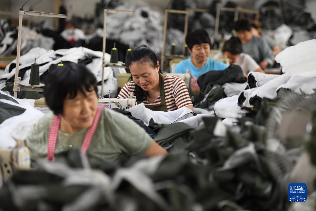 5月25日,山東省日照市莒縣福利服裝廠(chǎng)工人在趕制訂單服裝。