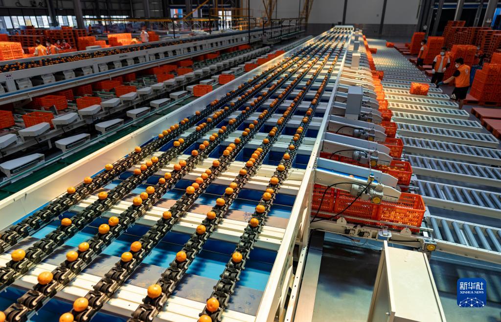 這是5月27日在賓川縣一家農業(yè)企業(yè)內拍攝的柑桔分選流水線(xiàn)。