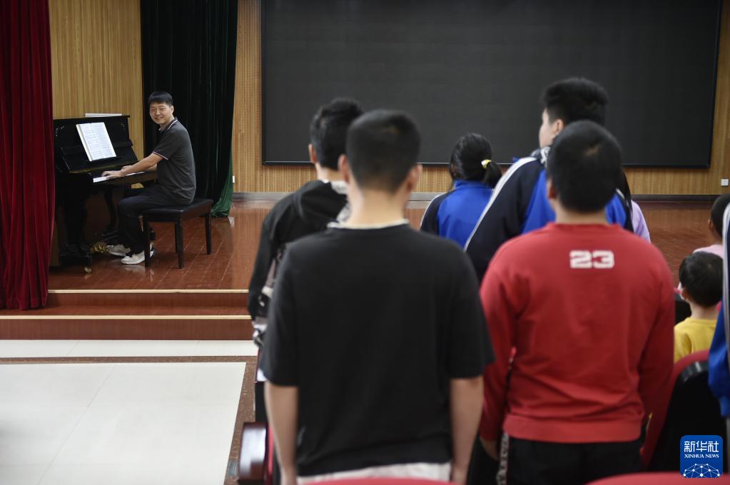 5月24日,在許昌市特殊教育學(xué)校,志愿者劉振乾(左一)在指導盲童合唱團的團員進(jìn)行練習。