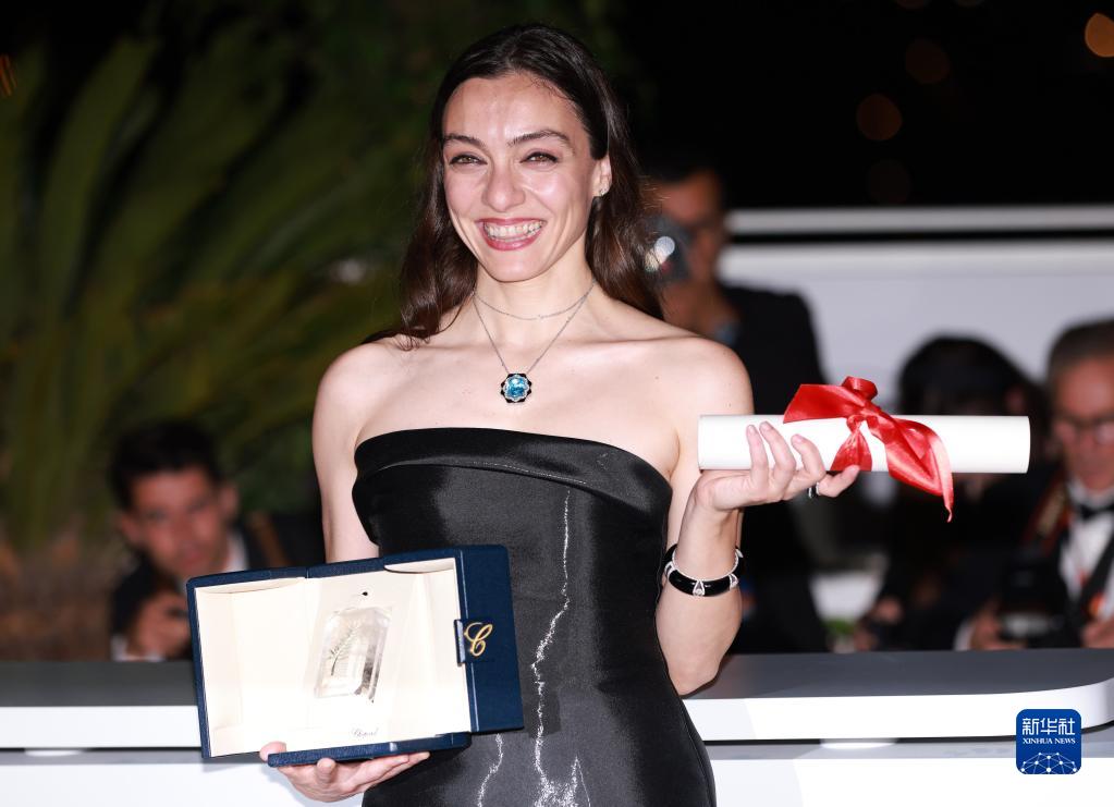 5月27日,在法國戛納,憑借影片《枯草》中的精彩表演獲得電影節最佳女演員獎的土耳其演員米爾維·迪茲達爾展示獎杯。