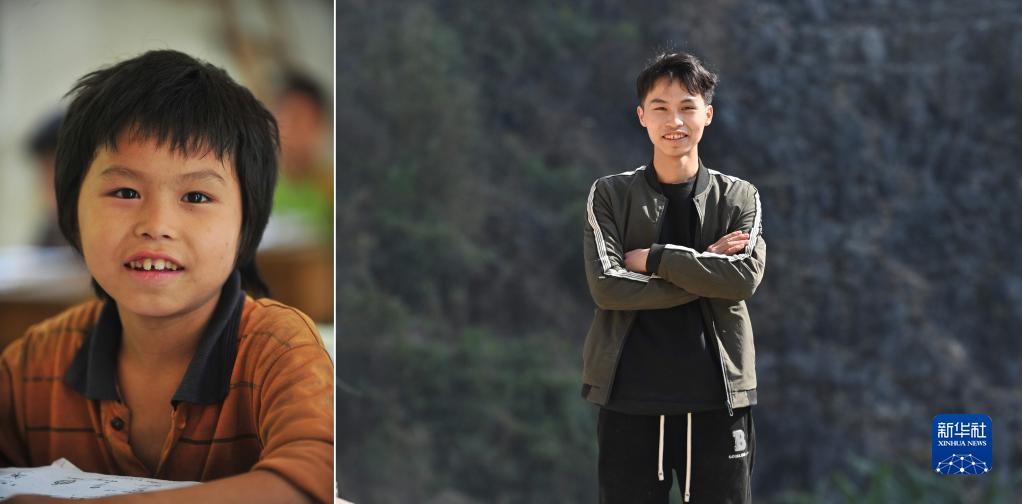 拼版照片:左圖為2012年7月4日,在大化瑤族自治縣板升鄉弄勇小學(xué),7歲的蒙錦晨在課堂上;右圖為2023年1月25日,在大化瑤族自治縣板升鄉弄勇村,正在浙江省臺州職業(yè)技術(shù)學(xué)院讀大一的蒙錦晨寒假回家時(shí)在村中留影。