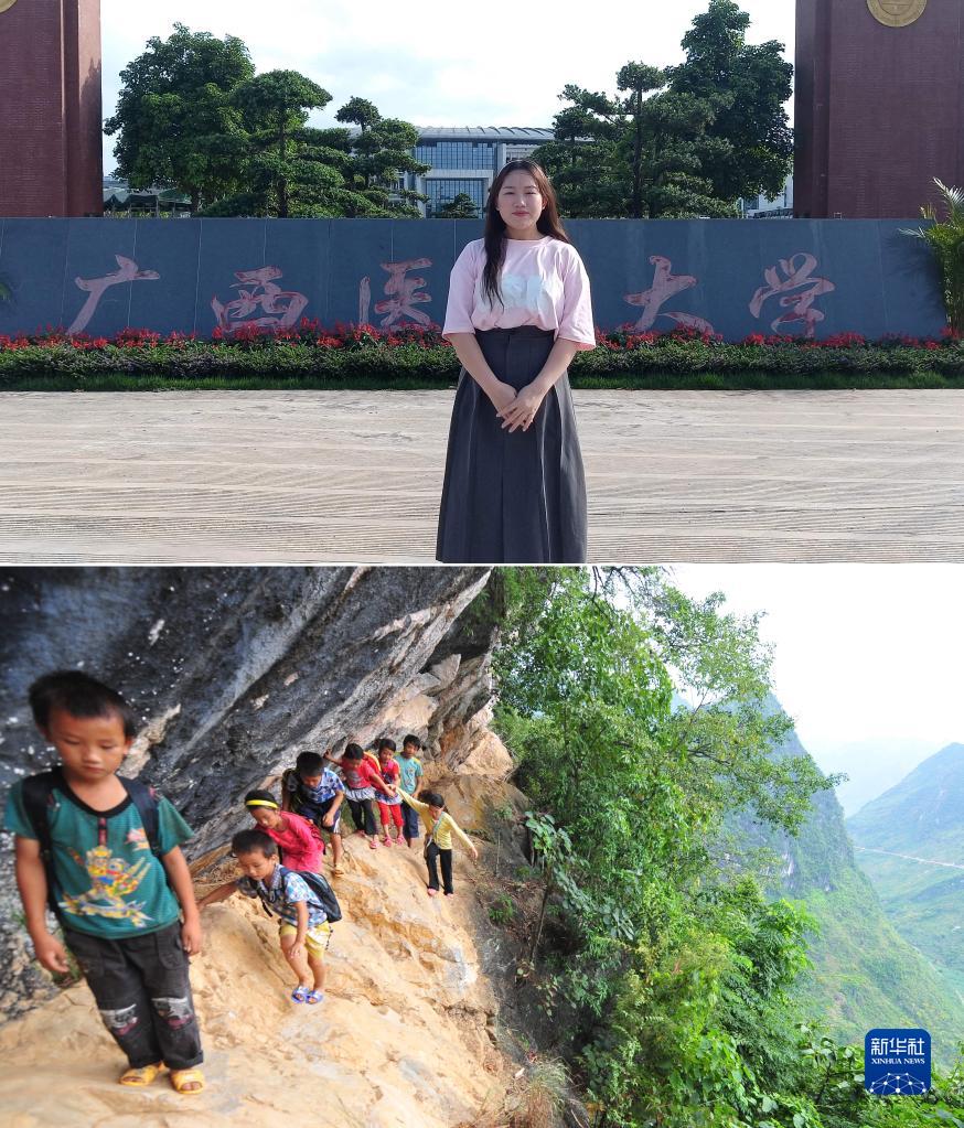 拼版照片:上圖為2023年5月27日,22歲的蒙秋艷站在她就讀的廣西醫科大學(xué)校門(mén)口(新華社發(fā));下圖為2012年9月3日,在大化瑤族自治縣板升鄉弄雷村哈保屯,11歲的蒙秋艷(右一)在懸崖邊護著(zhù)低年級的小伙伴回家(新華社記者黃孝邦攝)。2021年,蒙秋艷以?xún)?yōu)異的成績(jì),考取廣西醫科大學(xué)。