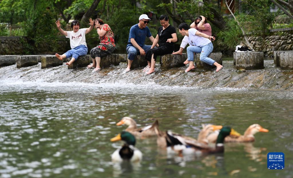 5月27日,游客在貴州省銅仁市江口縣太平鎮云舍景區小溪邊休憩。