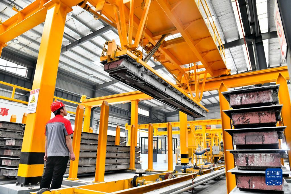 5月28日,在嘉祥縣國家級裝配式建筑產(chǎn)業(yè)園,工人在生產(chǎn)線(xiàn)上操作機械,加工裝配式建材混凝土砌塊。