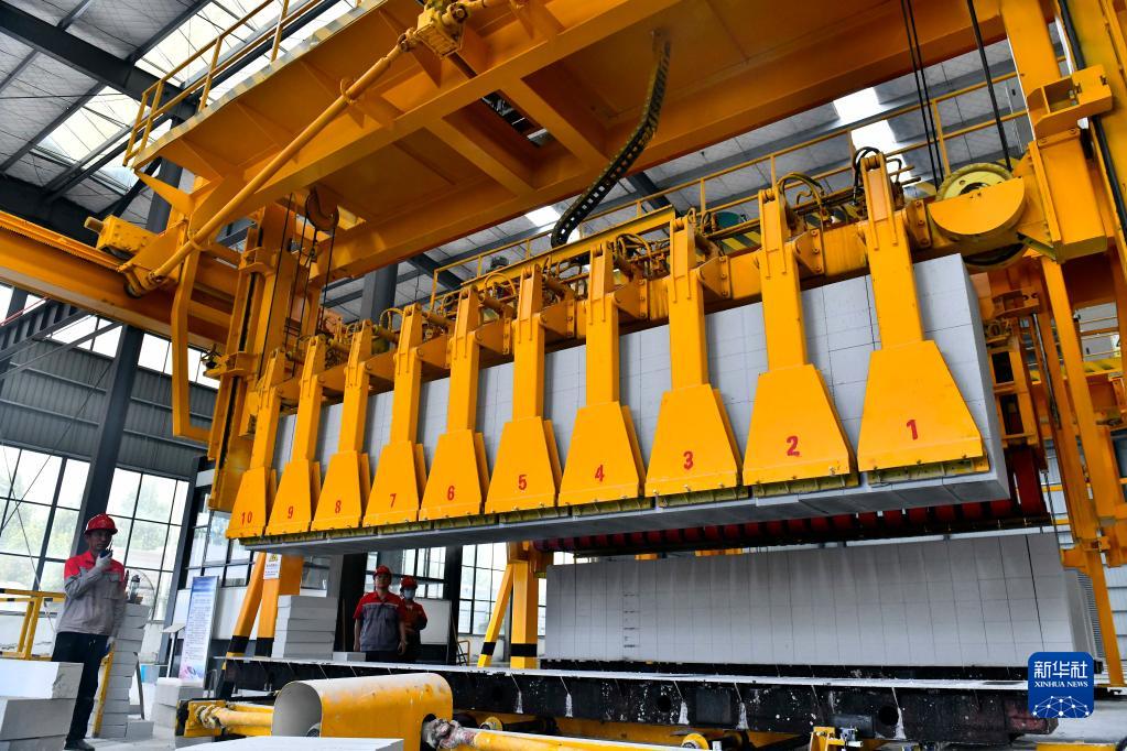 5月28日,在嘉祥縣國家級裝配式建筑產(chǎn)業(yè)園,工人在生產(chǎn)線(xiàn)上操作機械,加工裝配式建材混凝土砌塊。