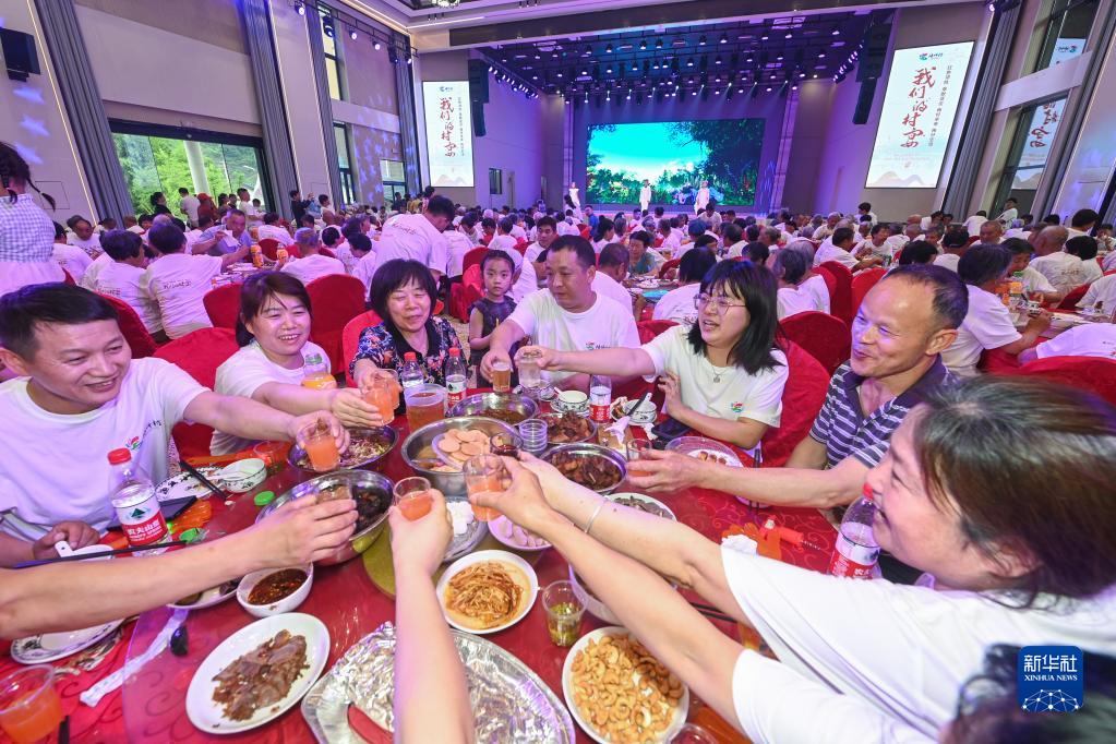 5月27日,梅坪村的村民在新建成的文化中心內的村文化禮堂吃百家宴。
