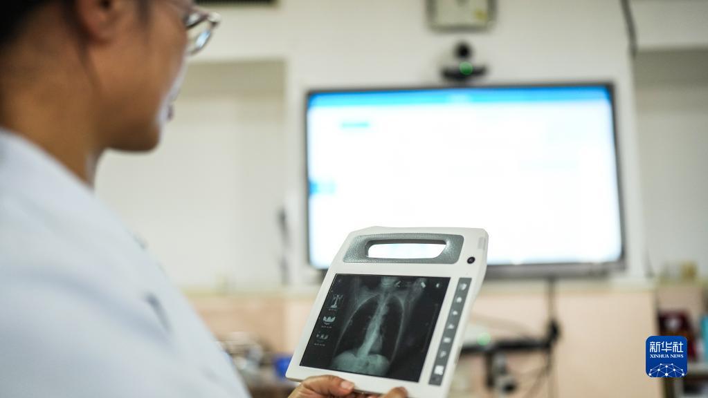 貴州省人民醫院呼吸科主任醫師通過(guò)5G+遠程醫療平臺查看龍里縣人民醫院患者的醫學(xué)影像報告(5月25日攝)。