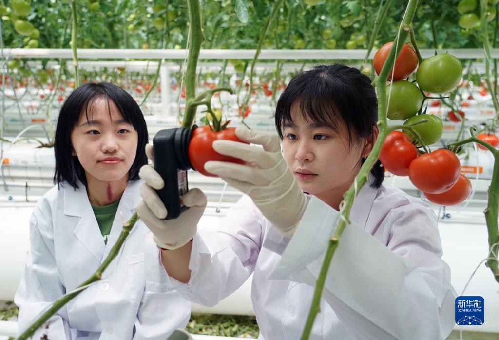 5月28日,在位于平谷區峪口鎮的京瓦溫室園藝示范園,西樊各莊科技小院駐村大學(xué)生朱思蓉(右)測量番茄果實(shí)硬度。