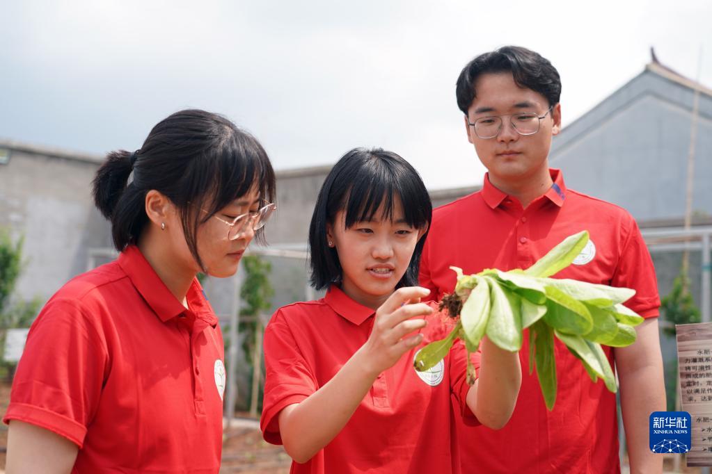 在峪口鎮西樊各莊科技小院,駐村大學(xué)生王雯欣(中)與王萌(右)及朱思蓉查看孔雀菜的生長(cháng)狀況(5月17日攝)。