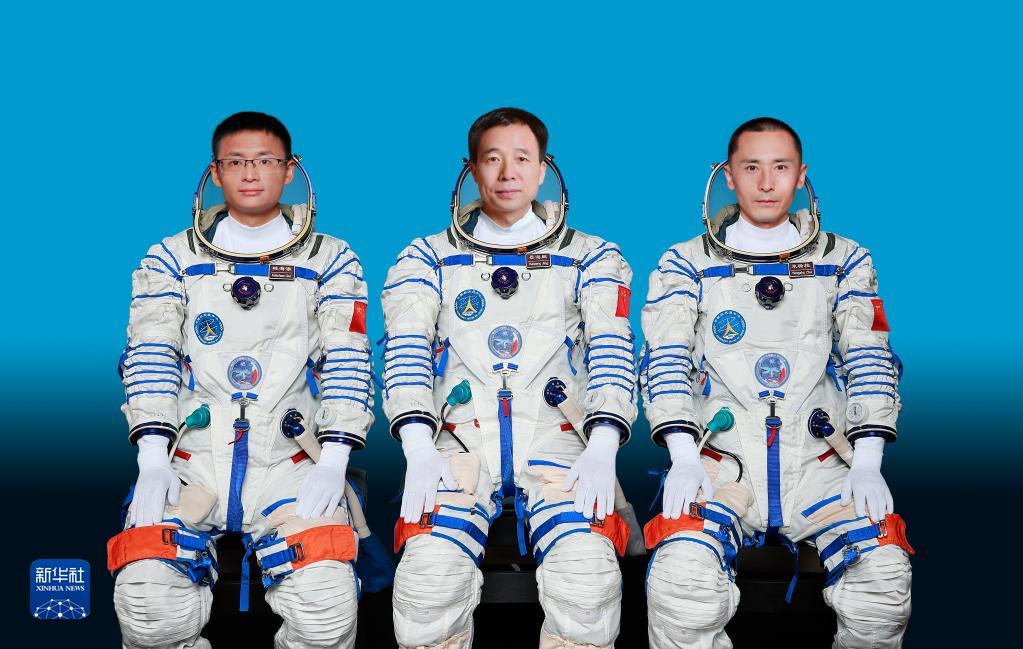 這是神舟十六號航天員景海鵬(中)、朱楊柱(右)、桂海潮。