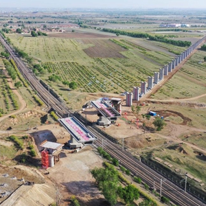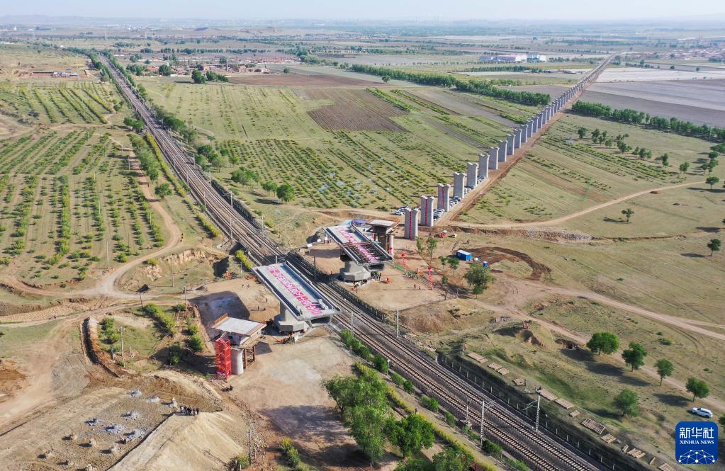 5月29日,集大原高鐵跨京包鐵路連續梁轉體作業(yè)中(無(wú)人機照片)。