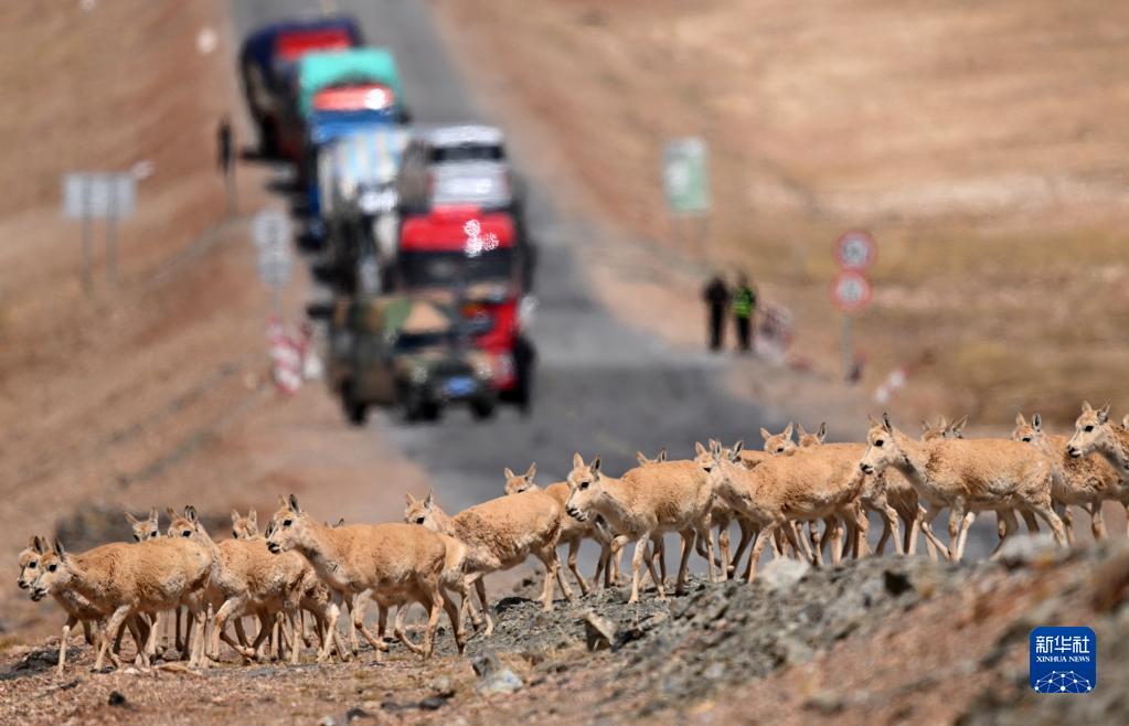 5月29日,在青??煽晌骼?,一群雌性待產(chǎn)藏羚羊通過(guò)青藏公路。