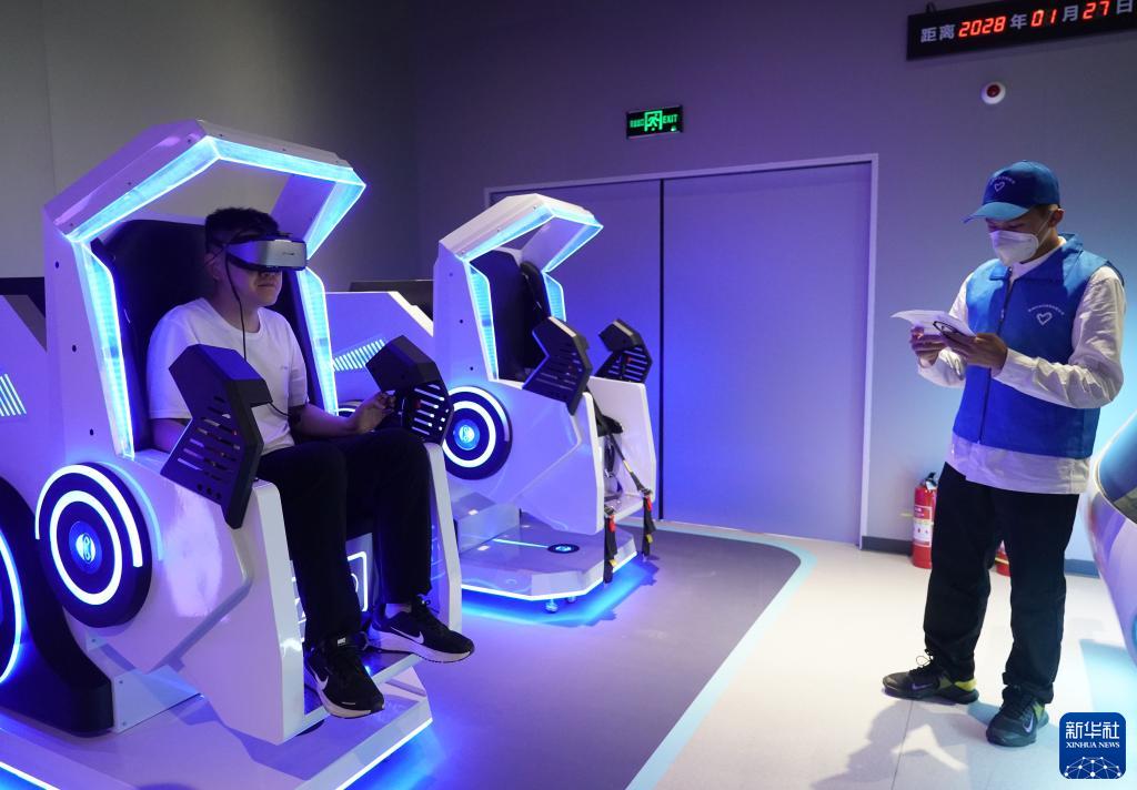 5月30日,觀(guān)眾(左)在科幻產(chǎn)業(yè)新技術(shù)新產(chǎn)品展現場(chǎng)體驗一款VR(虛擬現實(shí))設備。