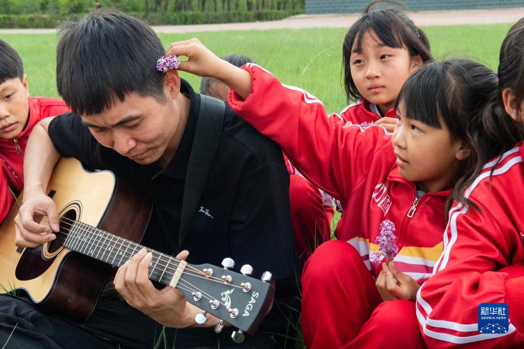 5月29日,在安達市任民鎮中心小學(xué)校園的草坪上,音樂(lè )班的孩子在練習合唱時(shí)把丁香花別在音樂(lè )老師李平的耳朵上。