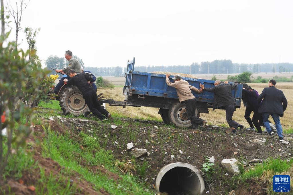 5月30日,在河南省駐馬店市正陽(yáng)縣銅鐘鎮,村民在幫忙推車(chē),車(chē)里裝著(zhù)剛收獲的小麥。