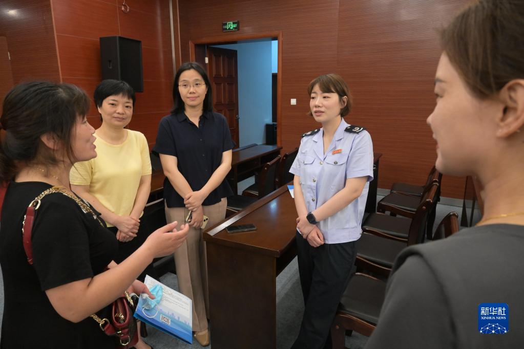 5月30日,工作人員在活動(dòng)現場(chǎng)聽(tīng)取外貿企業(yè)代表(左一、右一)意見(jiàn)和建議,為企業(yè)答疑解惑。