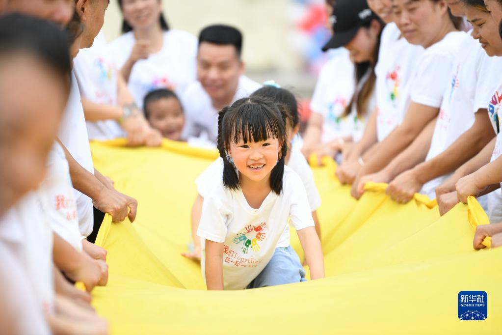 5月30日,在貴州省遵義市余慶縣飛鷹幼兒園迎“六一”親子活動(dòng)中,家長(cháng)和小朋友在參加親子活動(dòng)。