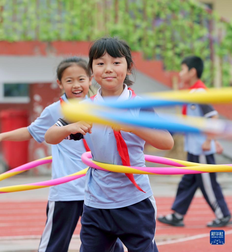 5月30日,河北省邢臺市廣宗縣第六小學(xué)學(xué)生在參加呼啦圈游戲。