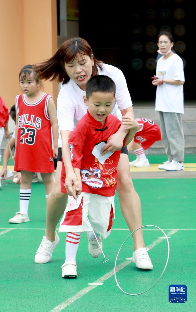 5月30日,在四川省華鎣市杜家坪幼兒園,家長(cháng)和孩子在一起參加滾鐵環(huán)游戲。