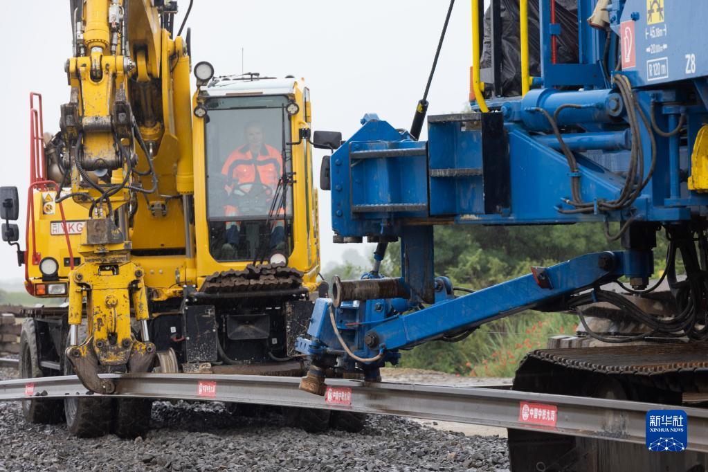 5月30日,在匈塞鐵路匈牙利段孔圣米克洛什-陶什站施工現場(chǎng),工作人員操作機械鋪設鋼軌。