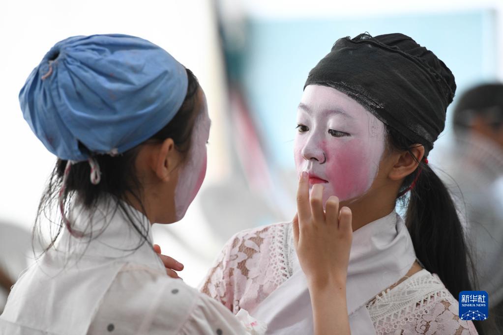 5月30日,伏嶺鎮中心小學(xué)“徽劇童子班”學(xué)生方甜甜和王玉琴(右)在化妝時(shí)交流。