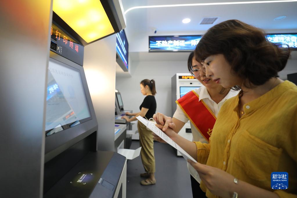 5月30日,在滁州市政務(wù)服務(wù)中心,工作人員給一名用自助服務(wù)機打證明材料的市民講解材料細節。