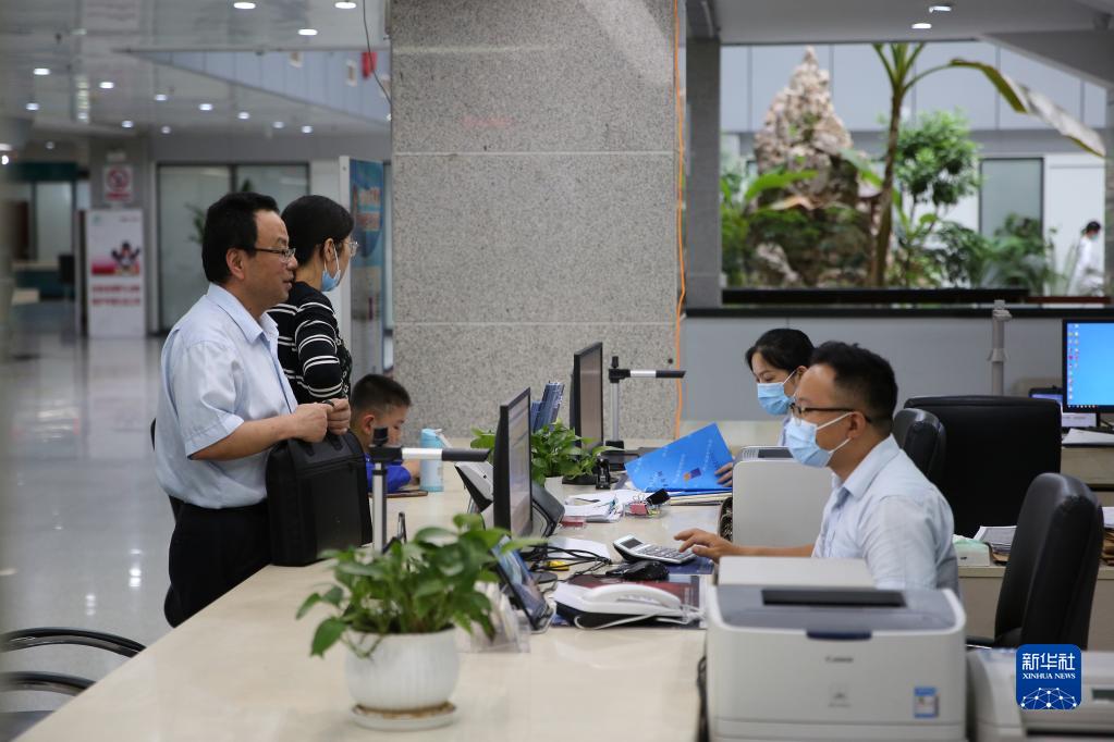 5月30日,在滁州市政務(wù)服務(wù)中心,銀行工作人員為市民辦理業(yè)務(wù)。