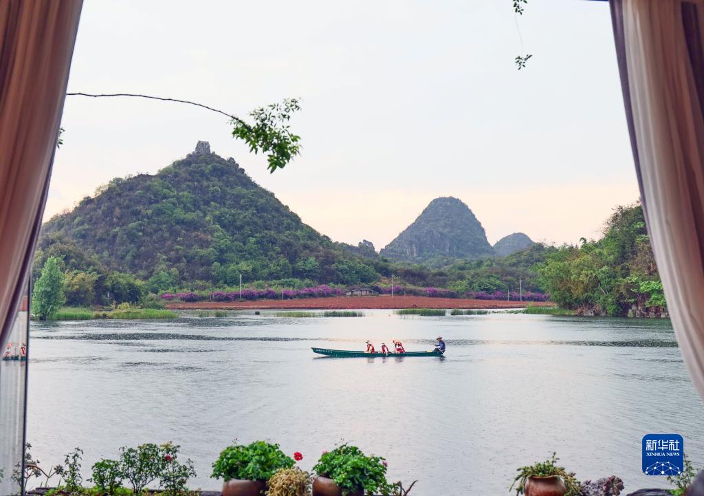 5月30日,游客乘船在普者黑景區仙人洞村游覽。