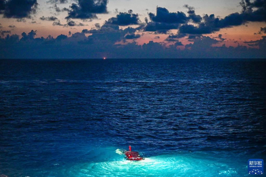 在結束當日的水下調查后,搭載著(zhù)考古隊員的“深海勇士”號載人潛水器浮出海面(5月27日攝)。