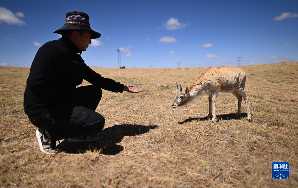 在可可西里國家級自然保護區索南達杰保護站,巡山隊員扎西桑周在野生動(dòng)物救助中心內與一只被救助的小藏羚羊互動(dòng)(5月30日攝)。