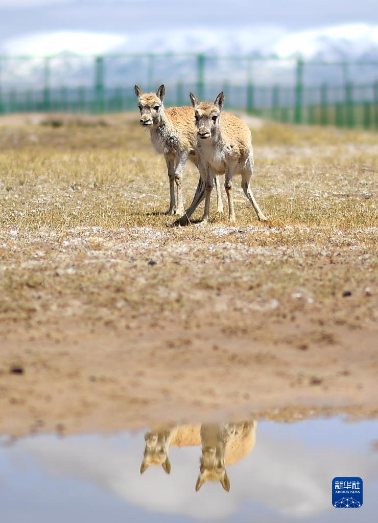 在可可西里國家級自然保護區索南達杰保護站,兩只藏羚羊在野生動(dòng)物救助中心活動(dòng)(5月30日攝)。