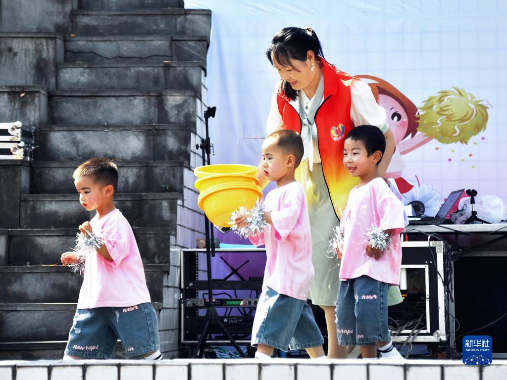 5月30日,在四川巴中市南江縣集州街道楊家河社區舉辦的慶“六一”文藝演出活動(dòng)中,“童伴媽媽”吳莉陪伴著(zhù)孩子們上臺表演節目。