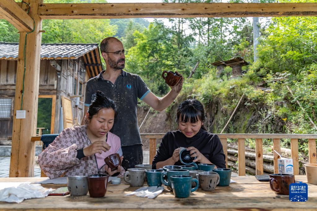 5月29日,在重慶市城口縣北屏鄉松柏村,文森·漆在工作室外查看拋光后的漆器。