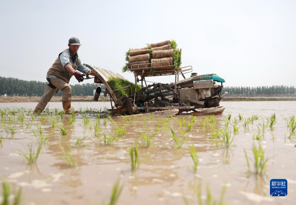 5月31日,河北省唐山市豐南區夏新莊村的農民在田間進(jìn)行插秧作業(yè)。