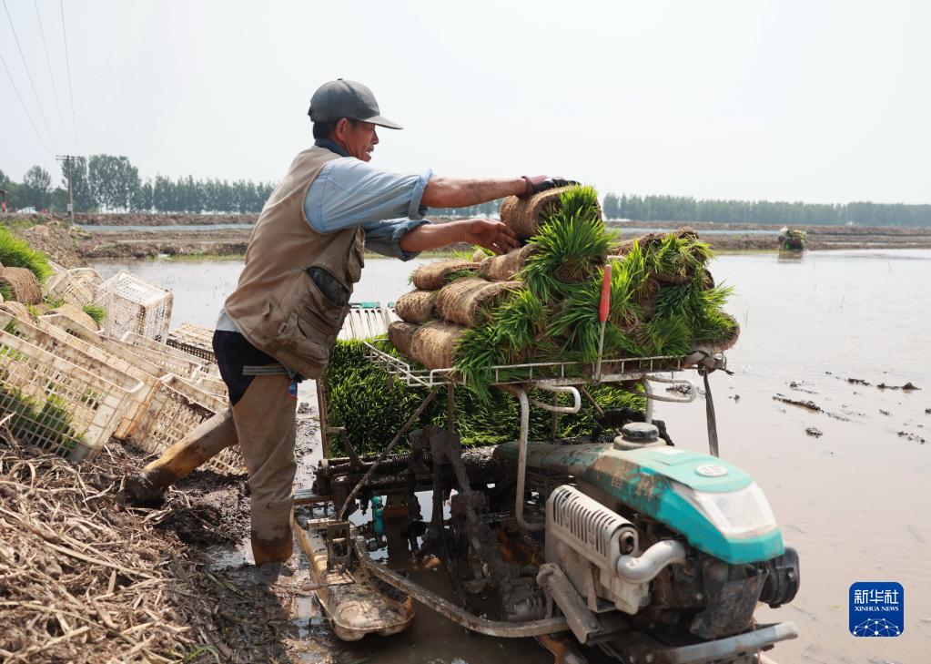 5月31日,河北省唐山市豐南區夏新莊村的一位農民將稻秧擺放到插秧機上。
